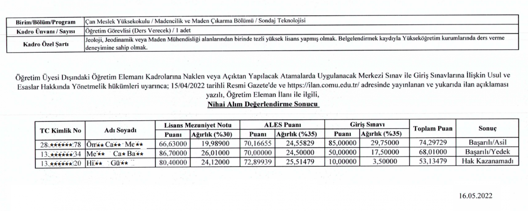 15.04.2022 tarihli Resmi Gazete'de Yayınlanan Madencilik ve Maden Çıkarma Bölümü Sondaj Teknolojisi Programı Öğretim Görevlisi Alımı Sonuçları