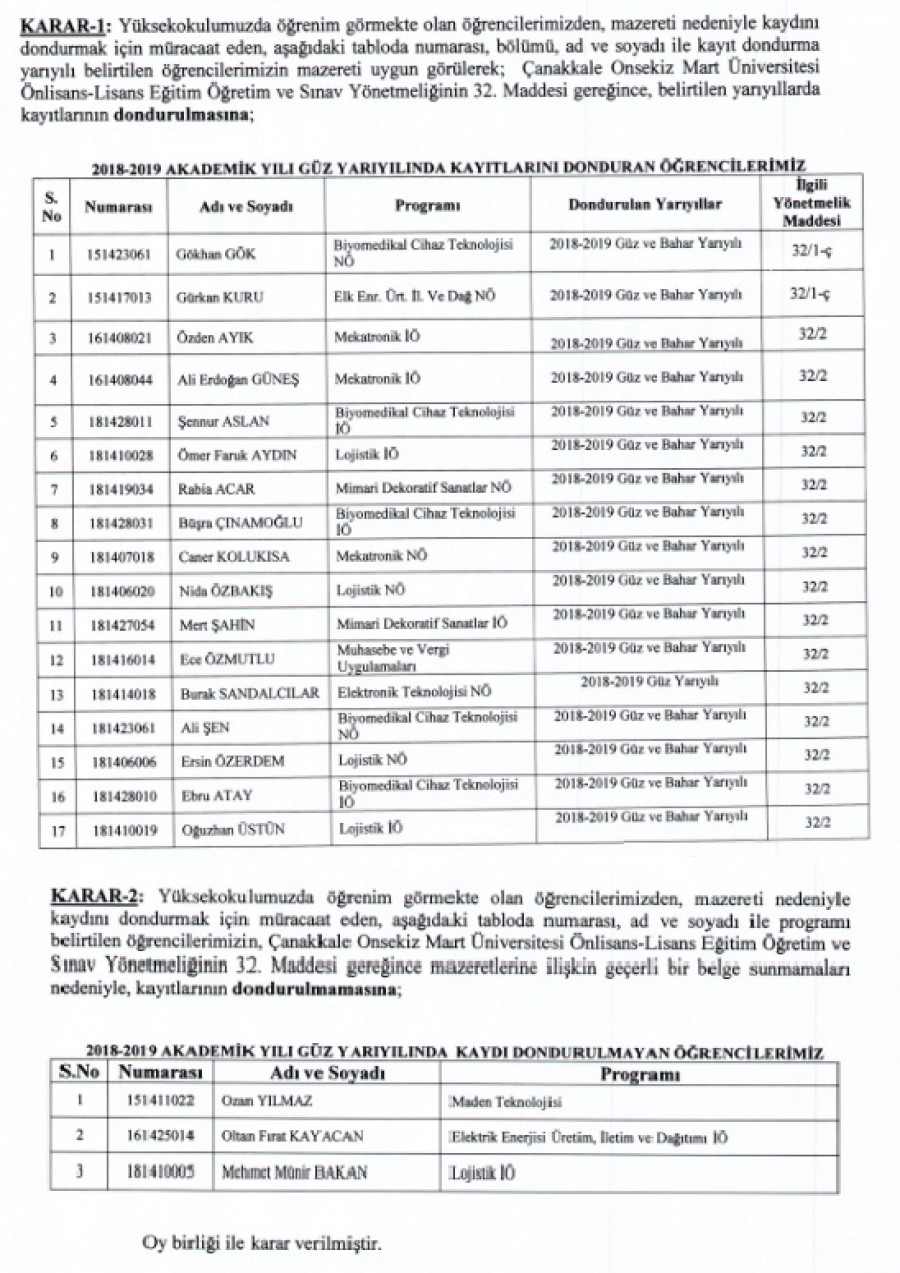 2018-2019 GÜZ KAYIT DONDURMALAR