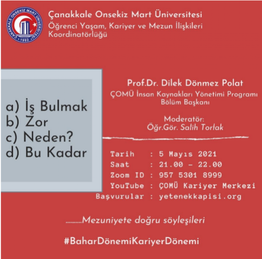Üniversitemiz Öğrenci Yaşam,Kariyer ve Mezun İlişkileri Koordinatörlüğü tarafından "Mezuniyete Doğru" söyleşileri kapsamında bu dönem düzenlenecek kariyer etkinliklerinden ilki, 5 Mayıs 2021 Çarşamba akşamı 21.00-22.00 saatleri arasında online olarak gerçekleştirilecektir. Bu dönem etkinlikleri ile birlikte, Cumhurbaşkanlığı İnsan Kaynakları Ofisi tarafından hazırlanan ve öğrencilerimizi iş, staj yarışma, söyleşiler vb. kariyer etkinlikleri ile buluşturan https://www.yetenekkapisi.org platformu da daha aktif bir şekilde kullanılmaya ve duyurulmaya çalışılacaktır.