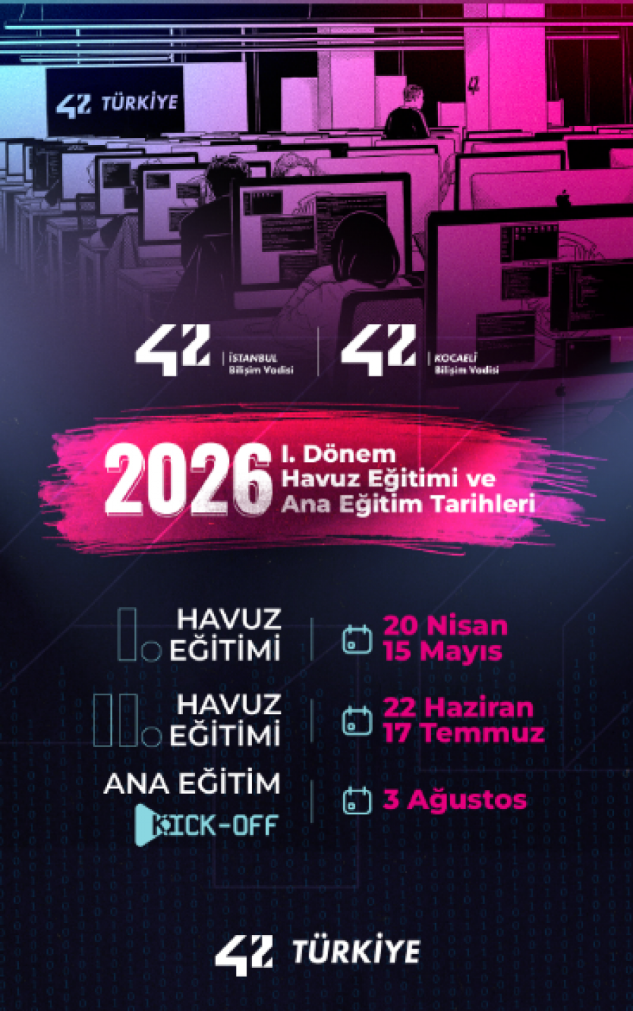 Bakanlığımız himayelerinde ve Bilişim Vadisi yürütücülüğünde faaliyet gösteren 42 Türkiye; yazılım alanında nitelikli insan kaynağının yetiştirilmesine katkı sağlamak amacıyla tamamen ücretsiz ve yenilikçi bir eğitim modeli sunmaktadır. Proje tabanlı ve akran öğrenimine dayalı eğitim yaklaşımıyla yürütülen program, Milli Teknoloji Hamlesi hedefleri doğrultusunda ülkemizin yazılım geliştirici ihtiyacının karşılanmasına katkı sağlamayı amaçlamaktadır. 2026 yılı eğitim dönemine ilişkin başvuru süreci