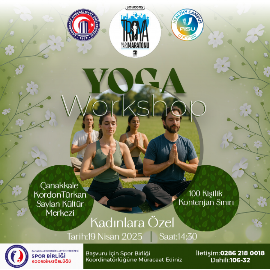 Çanakkale İlk kez gerçekleştirilecek olan "Troya Yarı Maratonu" 19 - 20 Nisan 2025 tarihlerinde Çanakkale kordon bölgesinde gerçekleştirilecektir. Üniversitemiz Sağlıklı Kampüs ve Spor Dostu anlayışıyla maratonun paydaşı olarak çalışmalarını sürdürmektedir. Bu bağlamda etkinliğin ilk günü olan 19 Nisan 2025 cumartesi günü saat 14.30 - 15.30 arasında Çanakkale kordonda Sweaty Betty Yoga Workshop (kadınlara özel) isimli etkinlik gerçekleştirilecektir.