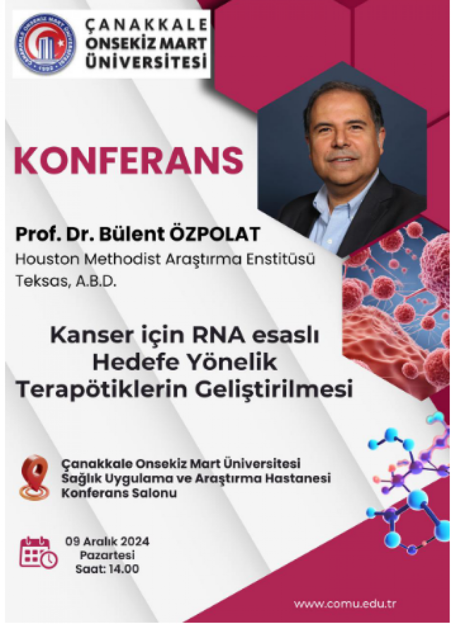 Fakültemiz Temel Tıp Bilimleri Bölümü Öğretim Üyesi Doç. Dr. Ferah CÖMERT ÖNDER'in yürütücüsü olduğu projenin yurtdışı araştırmacısı Amerika Birleşik Devletleri Houston Methodist Araştırma Merkezinde kanser biyolojisi ve immünoloji alanında çalışmalarını sürdüren bilim insanı Prof. Dr. Bülent ÖZPOLAT, Üniversitemiz Hastanesi Konferans Salonunda 09.12.2024 saat 14.00'te “Kanser için RNA Esaslı Hedefe Yönelik Terapötiklerin Geliştirilmesi” Konferansı düzenlenecektir.