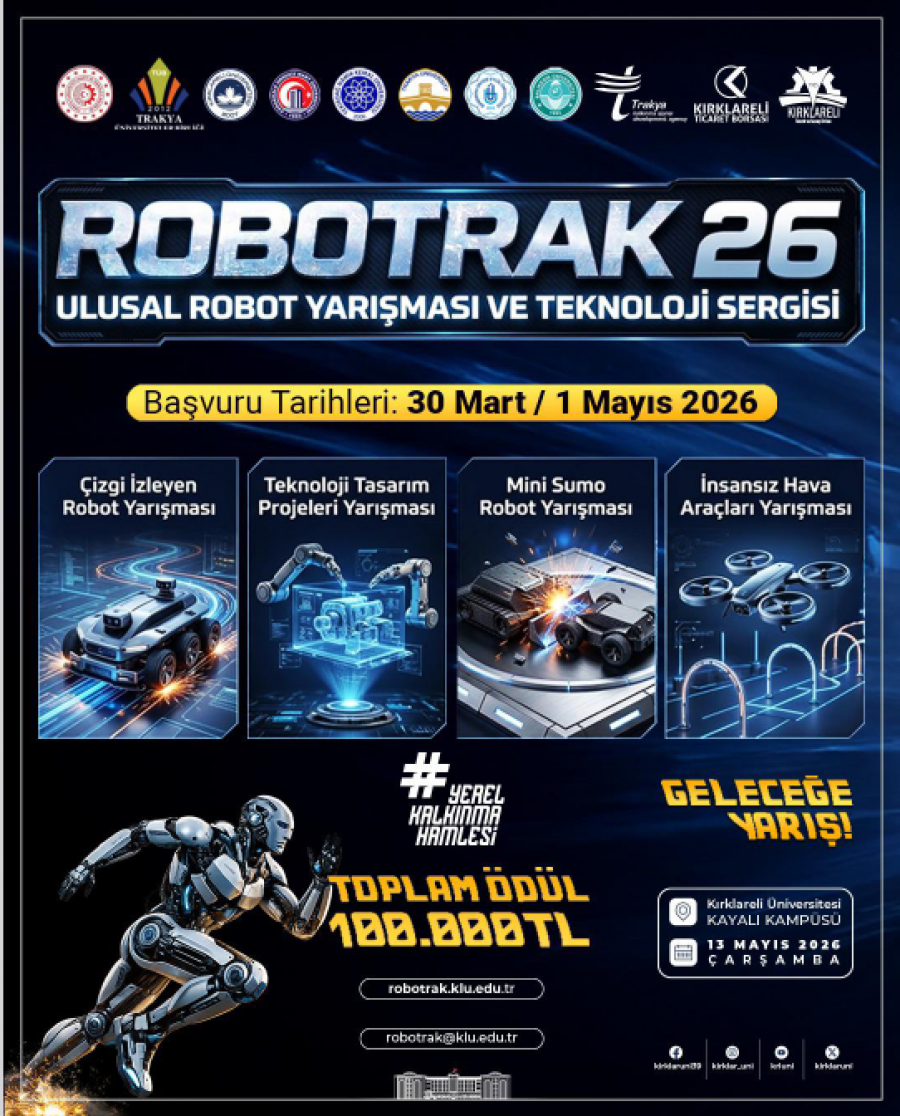 Söz konusu etkinliğe başvurular 3 0 M a r t – 1 M a y ı s 2 0 2 6 tarihleri arasında alınacak olup, robotrak@klu.edu.tr e-posta adresi üzerinden yapılacaktır. Etkinliğe ilişkin detaylı bilgilere https://robotrak.klu.edu.tr adresinden ulaşılabilmektedir.