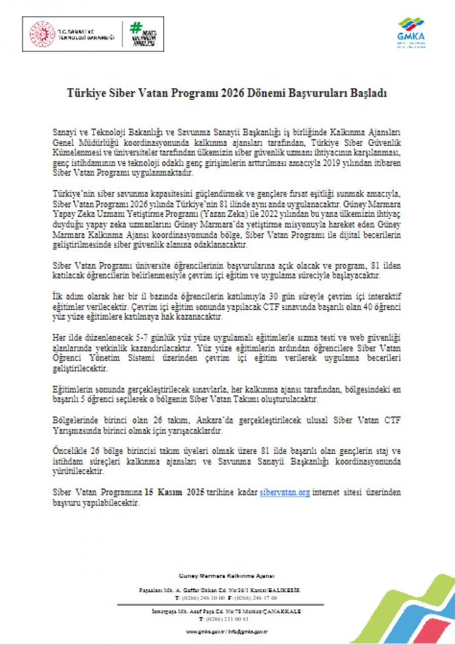 Güney Marmara Bölgesi'nde Ajansımız tarafından koordine edilecek olan Siber Vatan Programına 15 Kasım 2025 tarihine kadar https://sibervatan.org/ internet sitesi üzerinden başvuru yapılabilecektir.