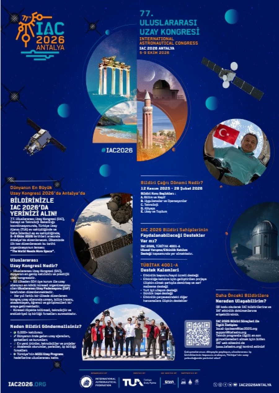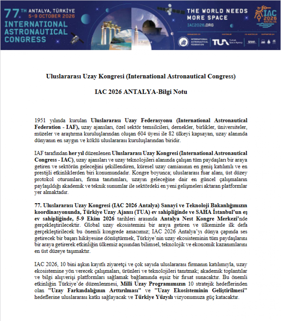 Uluslararası Uzay Kongresi (IAC 2026 Antalya) Sanayi ve Teknoloji Bakanlığımızın koordinasyonunda, Türkiye Uzay Ajansı (TUA) ev sahipliğinde ve SAHA İstanbul'un eş ev sahipliğinde, 5-9 Ekim 2026 tarihleri arasında Antalya Nest Kongre Merkezi'nde gerçekleştirilecektir. IAC 2026, uzay alanında politika yapıcıları, araştırmacıları, endüstri temsilcilerini ve uluslararası kuruluşları bir araya getiren prestijli bir etkinliktir. Kongre kapsamında teknik oturumlar, paneller, sergiler ve çalıştaylar düzenlenecek olup etkinlik; ülkemizin uzay yetkinliklerinin tanıtılması, uluslararası iş birliklerinin güçlendirilmesi ve bilimsel/teknolojik paylaşımın artırılması amacıyla büyük önem taşımaktadır.