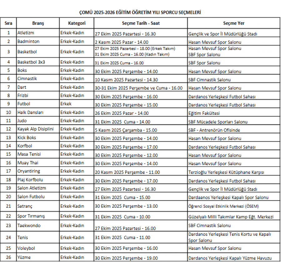 Türkiye Üniversite Sporları Federasyonu tarafından 2025-2026 eğitim-öğretim yılında düzenlenecek yurt içi ve yurt dışı organizasyonlar ile düzenlenecek diğer spor etkinliklerinde Üniversitemizi temsil edecek spor takımlarının oluşturulması için çalıştırıcılar tarafından sporcu seçmeleri aşağıda belirtilen programa göre yapılacaktır.