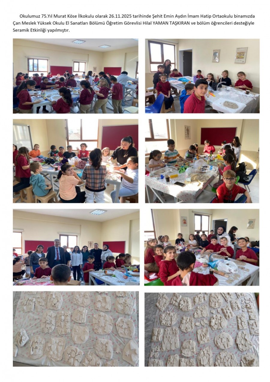 Yüksekokulumuz El Sanatları Bölümü, Çan İlçe Millî Eğitim Müdürlüğü ile imzalamış olduğu protokol kapsamında güz döneminde sosyal sorumluluk odaklı bir etkinliğe imza attı. Bu kapsamda, 75. Yıl Murat Köse İlköğretim Okulu öğrencilerinin katılımıyla bir seramik çalıştayı düzenlendi.
